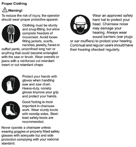 These protective garments contain pads of cut-retardant material designed to reduce the risk or severity of injury to the body parts covered by the pads in the event of contact with a rotating chain. The fibers in the pads provide extra layers of material and are designed to rip apart if they come into contact with the moving chain and to clog the sprocket and stop the chain in certain circumstances. In some contacts, the pads may stop the chain. In other contacts, the pads will resist the cutting process only for a fraction of a second. The actual degree of protection afforded will vary with the speed of the chain at the time of contact, the power and torque of the saw, the design of the chainsaw sprocket and similar factors. Follow the washing instructions. Improper care may destroy cut-retardant properties of the material. During shipping these pads may become compressed. By washing them prior to use and weekly during regular use, these pads fluff up and offer maximum protection.