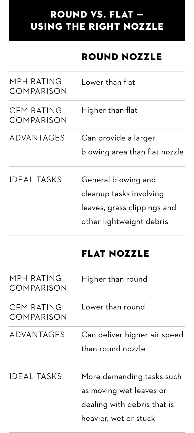 When the job demands higher air speed, flat nozzles are essential. Flat nozzles offer higher MPH ratings, which equates to stronger air speed. This makes flat nozzles ideal for situations where debris is heavier or stuck to an object or surface.