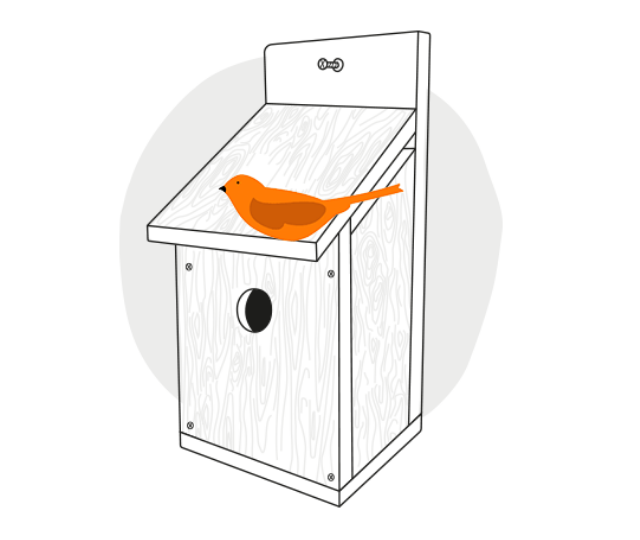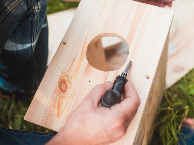 Drill a hole in the center of the front piece for which a bird can enter. Add a small hole for hanging in