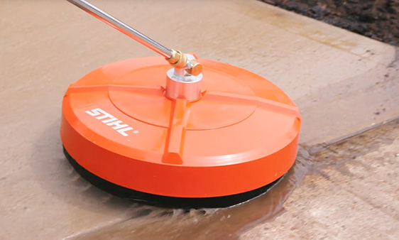 Before you apply stain, thoroughly clean the concrete using a hose or pressure washer with a rotary surface cleaner.