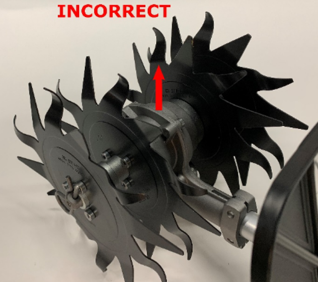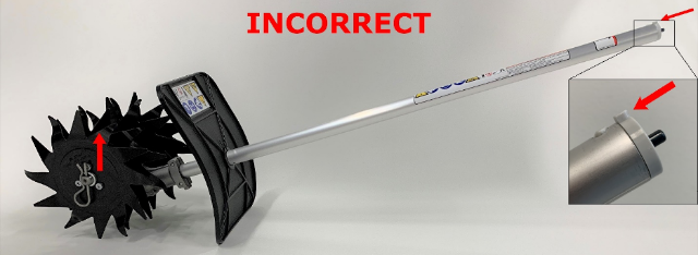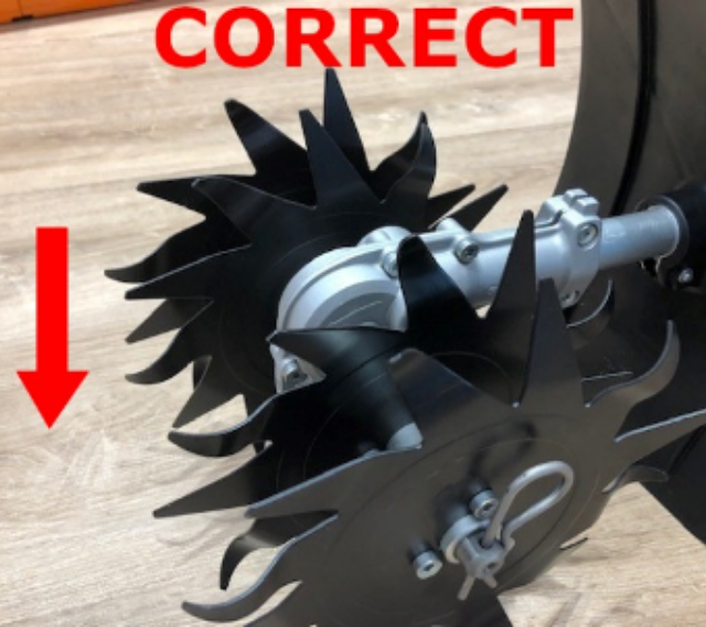 Properly assembled mini-cultivator attachment with the gearbox mounted so that the axle is below the drive tube.
