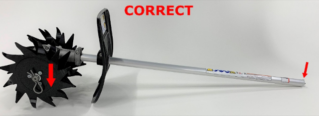 Proper assembly of mini-cultivator attachment with the gearbox mounted so that the axle is below the drive tube when the locating lug for the coupling to the powerhead at the other end is facing up.