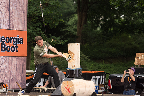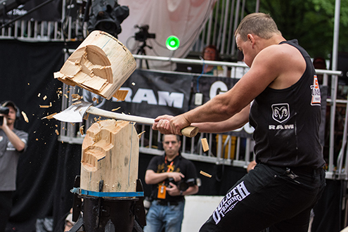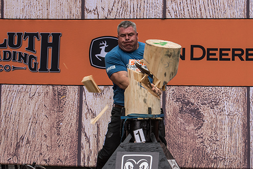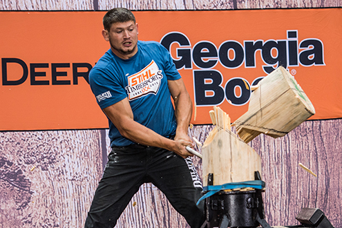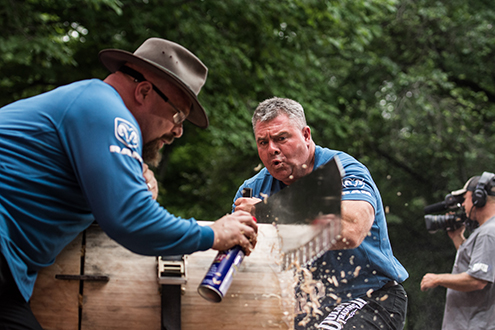 Although the lumberjack events seen on the Series look like the work professional lumberjacks do in the woods, thousands of careful, focused hours go into each one. Professional lumberjack competitors have training arenas at their homes or shops resembling the stage and stands seen at an event on the Series. This “chipyard” has a log pile of practice wood so that each competitor can make cuts to tune up his chopping or sawing, just like at the gym but usually outside. Set a log, make a cut, watch the film, and adjust. This pattern can go on for hours each day and occurs most months out of the year.